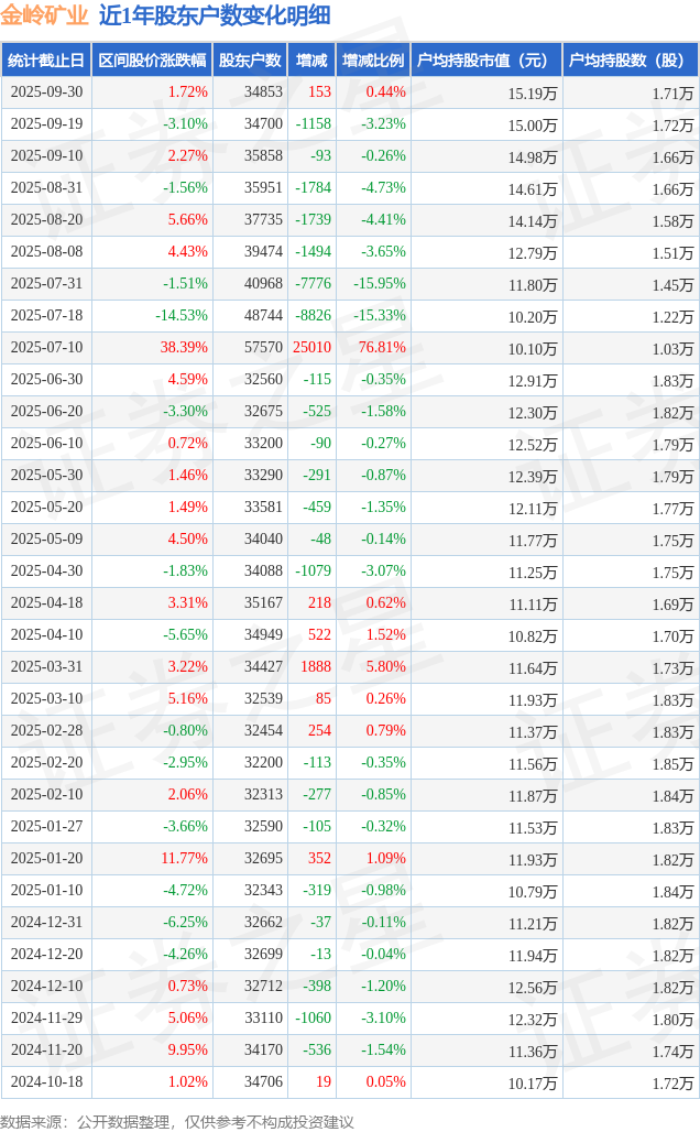 从股价来看,2025年9月19日至2025年9月30日,金岭矿业区间涨幅为1.72%,在此期间股东户数增加153.0户,增幅为0.44%。
