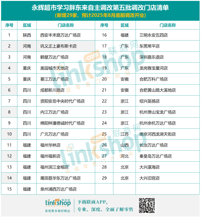 6月14日,在学习胖东来模式调改步入“百店”时代的第二天,永辉正式公布第五批29家胖东来模式调改门店清单,预计8月底前完成改造并开业。