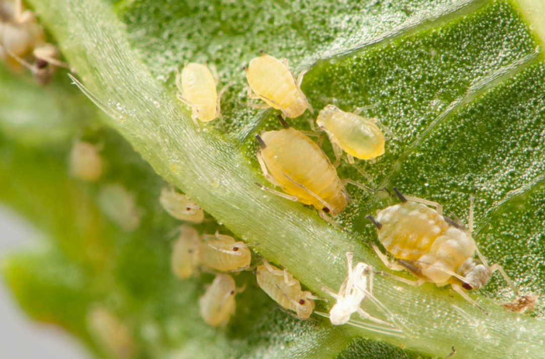 植物的新芽、新叶及叶片背面,很容易隐藏蚜虫。蚜虫通常为绿色,也有黑色等其他颜色,外形肉乎乎的,会吸食植物汁液,导致叶片向下卷曲,还会在新叶、新芽和花苞上大量聚集。