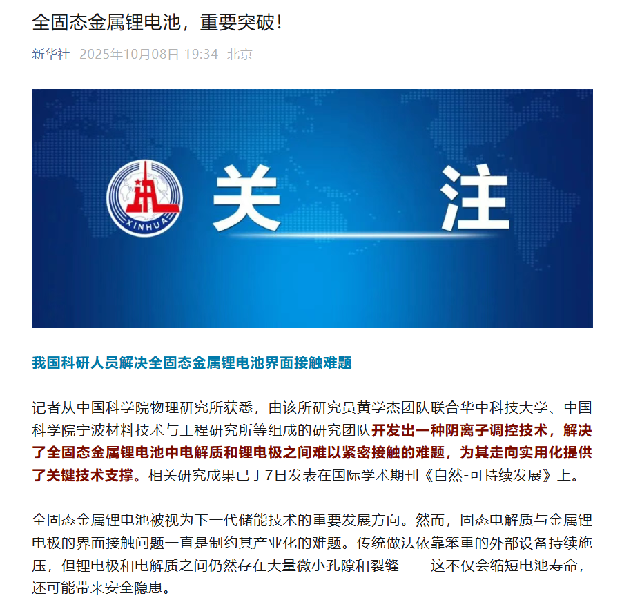 而且这个固态电池新发现极具分量,已经发表在了世界上最权威的学术期刊《自然》上,并且新华社等官媒已经进行了相关报道,足见这个研究成果有多伟大。