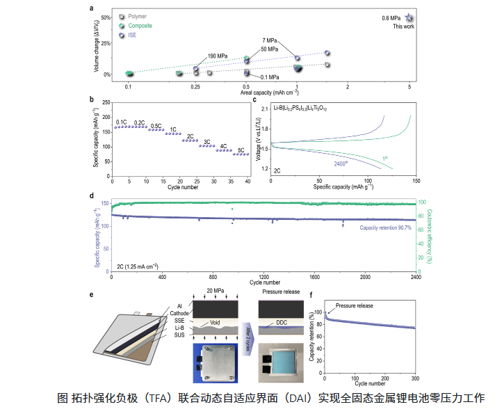 与此同时,团队还开发了拓扑强化负极(TFA),体积变化率仅为金属锂负极的40%,耐受压力范围拓宽至0-50 MPa,这一结构将表面锂“沉积/剥离”过程变成沿亲锂骨架的锂扩散输运行为。